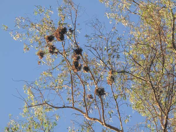 In a little valley in Santa Cruz, Monarch butterflies come from all over the west to overwinter in the eucalypts. Those orangey clumps are butterflies. In years past, this little valley was completely coated in butterflies. Now, there are only a few clumps.