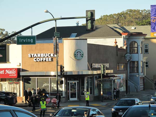 With the fierce San Francisco competition for your coffee dollars, Starbucks takes the unprecidented step of hiring crossing guards to usher you in for a cup'a.