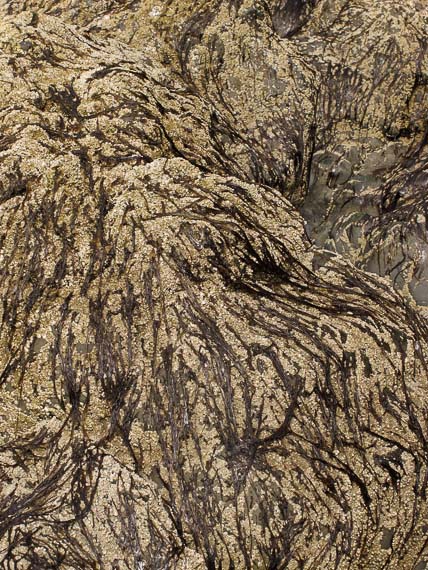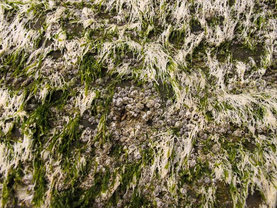 Hairlike seaweed spreads over rock and tiny barnacles.