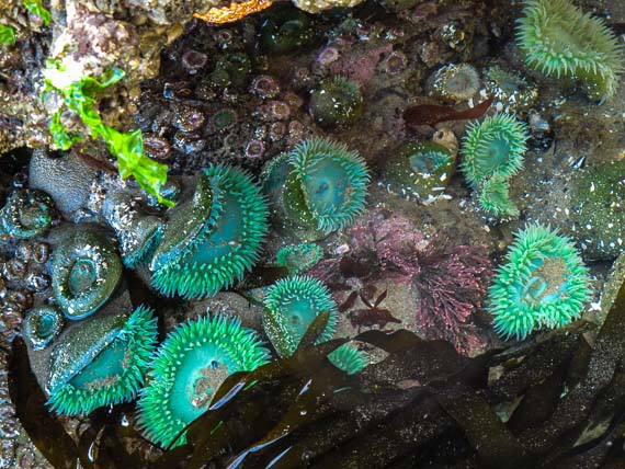 Haystack Rock's tide pools are resplendent in green.