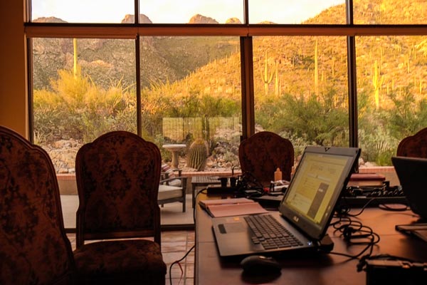 Wendy heads back into the office from our office patio. Yup. Hard to get any work done.