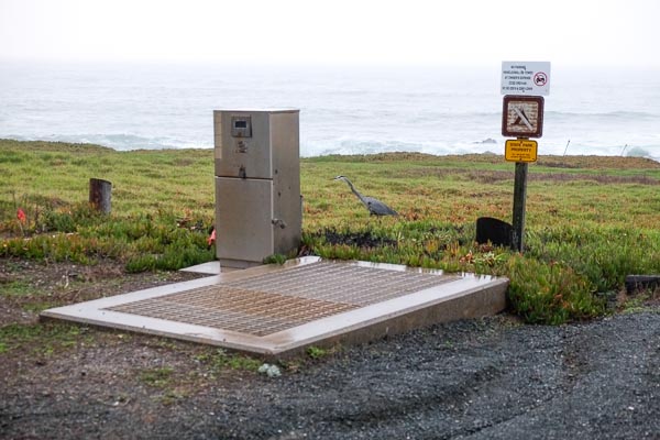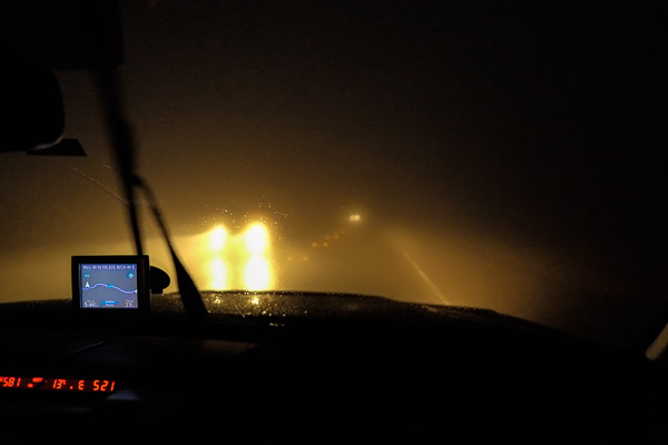 The drive back from Cambria featured near-zero visibility in the fog and black squalls of the day. Wendy skilfully avoids the local suicide deer.