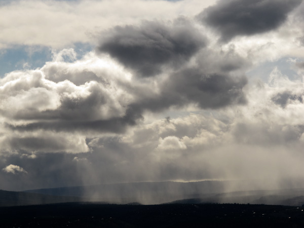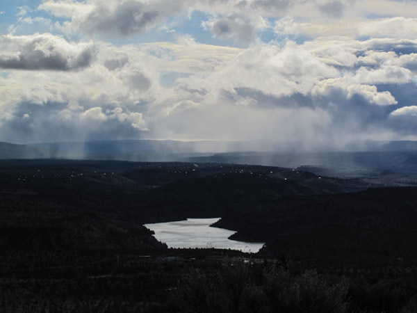 Rain falls on Lake Billy Chinook. We're high above on Round Butte.