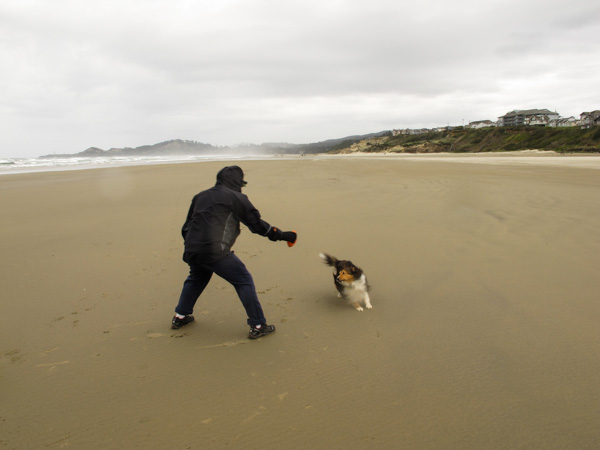 Shelties heed little attention to the incoming storm - especially when a game of beach football is at stake.
