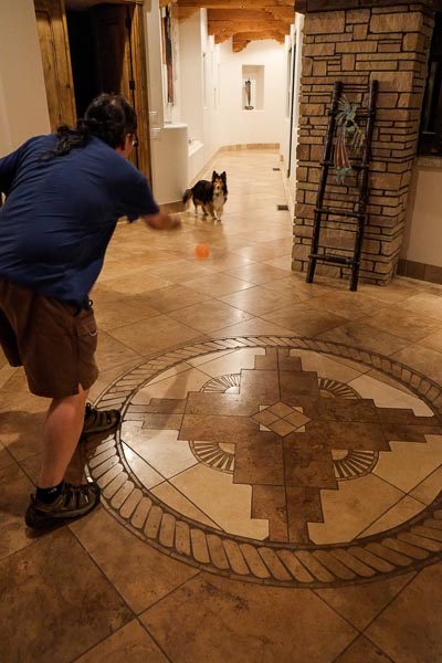 We obviously didn't give Emma nearly enough exercise today, as she insisted on a late evening game of Bowling for Shelties. The art hall corridor works very well indeed.