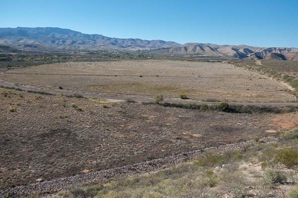 Just below Tuzigoot, the massive settlin' ponds of the Cottonwood copper mines. They were allowed to dry out, and after that, the wind would kick up enormous clouds of toxic orange dust. They only got around to cleaning it up in 2006. Dunno what happened to all the toxic dust that blew away, probably to Kansas.