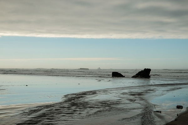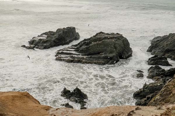 The tide is still too high to brave the headland bench.