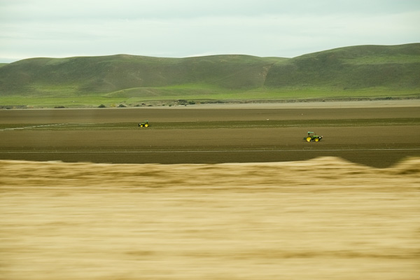 Further along, odd green tractors are tilling the ground with tiny little proby things.