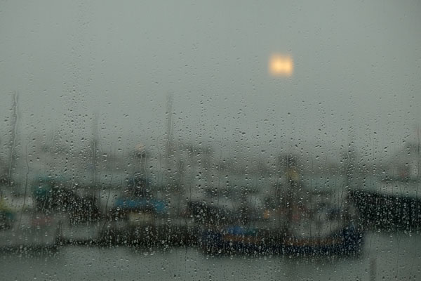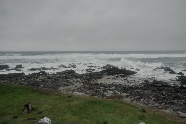 The sea and sky gods are very irritated today. High tide is super high. The Coast Guard is flying the double red pennant - gale warning.