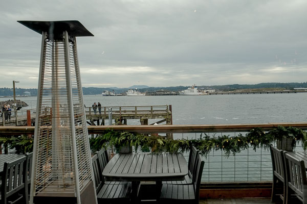 The Clearwater restaurant's outside deck, with a view of the very suspicious NOAA "research" vessels moored across the way.
