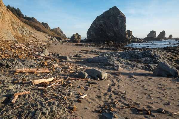 The sun dips behind the rock stacks on Lone Ranch Beach.