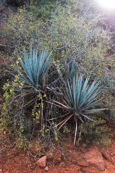 Late afternoon light illuminates the yuccas.