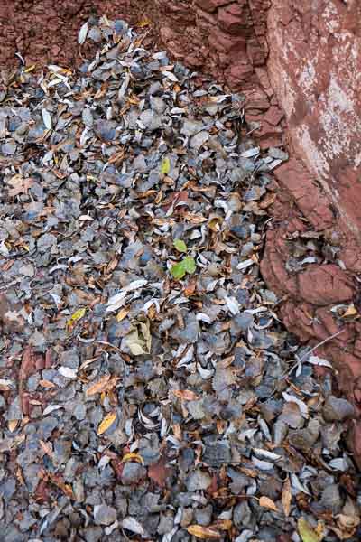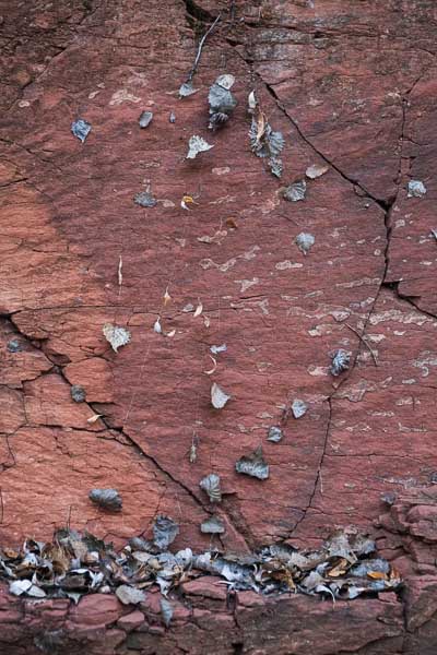 Leaves jumble in a red rock corner.