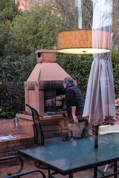 ........ in addition to his role of master fire builder. It was late afternoon coffee and pie at the outdoor fireplace in our amazing "bird garden".