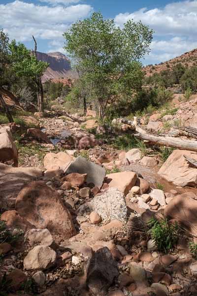 Canyonside trees and flora - the white patina is actually tiny livin' organisms - likely because there is a seep in the cliffside.