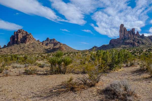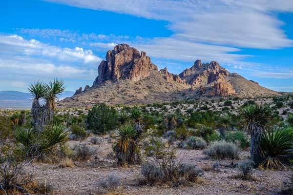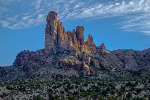 Yuccas is bloom - and catching the last rays in close to the grand massif.