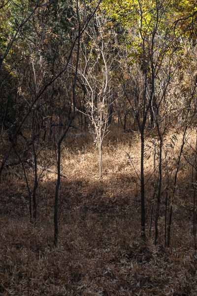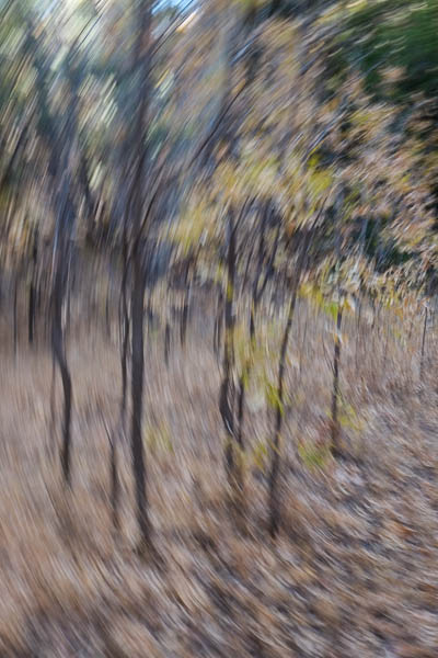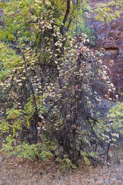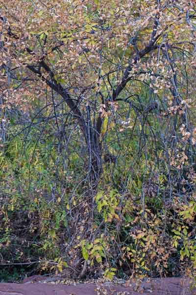 Leaves have mostly fallen from these entangled vines. Those remaining appear to almost float in the air.