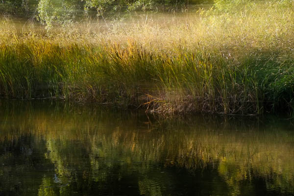 Creekside grasses bask in a small section of light cutting through the trees.