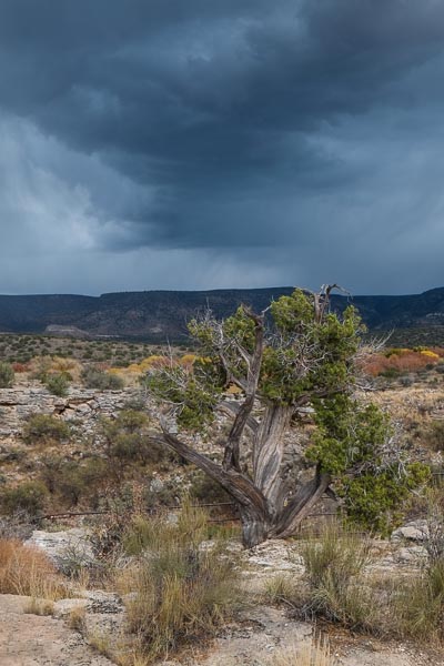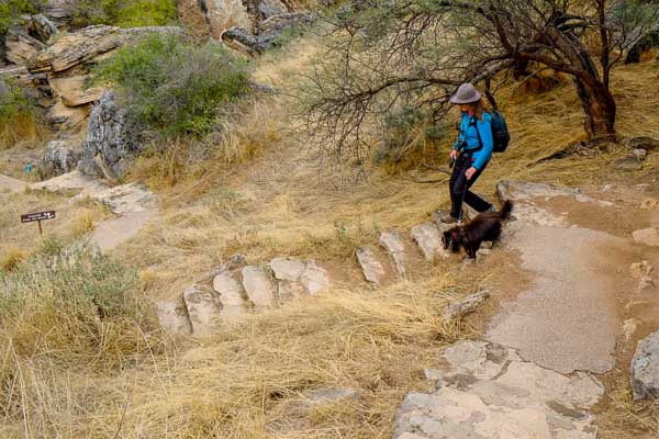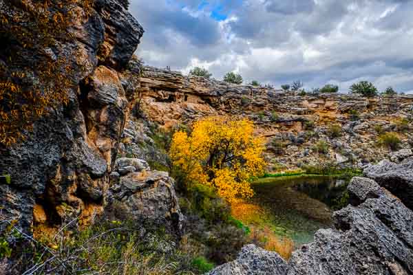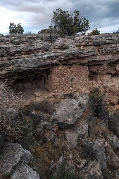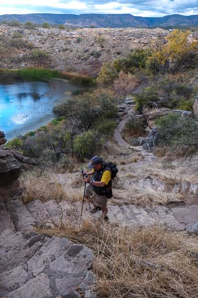 The Team walks up the little hill to Montezuma Well. The clouds think about raining on us.