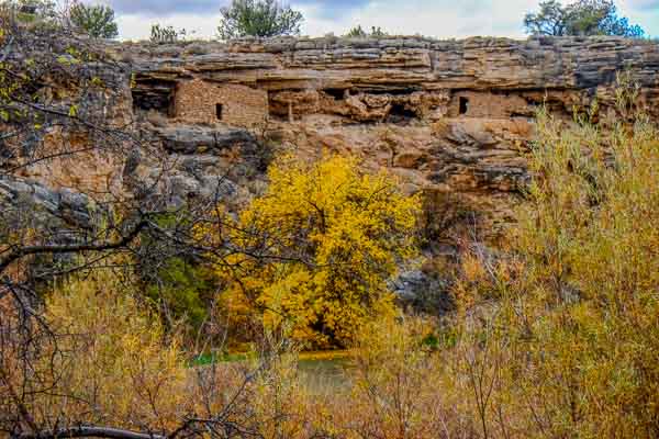 The cliff dwellings just below the rim. There are other dwellings closer to the water.