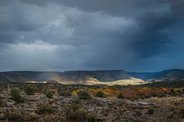 Our skies are roily today - but all the drama does yield a fleeting rainbow over our red rock view. Too cold and windy for the coffee porch today though!