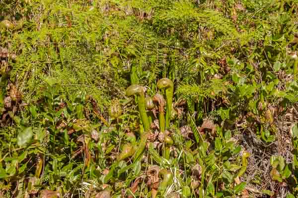 Years later we drop in on our friends the darlingtonias. They are just fine - thank you very much. They happily share their sanctuary with the skunk cabbages.