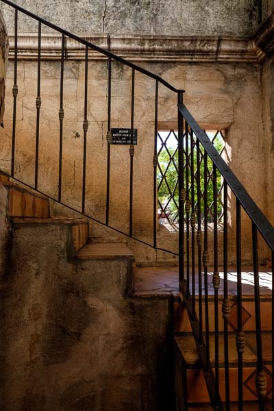 Quiet light in a back staircase. The plaque warns stair climbers to watch their head space. Large tree branches encroach!