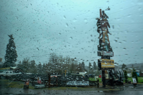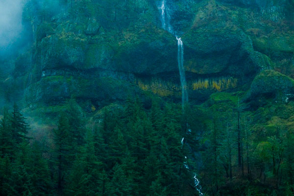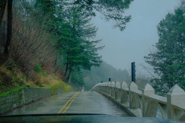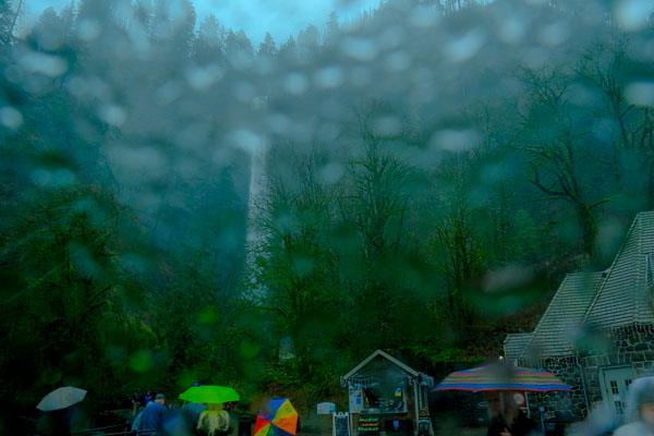 Not even the driving rain can keep tourists from the world-famous Multnomah Falls. The Historic Road is washed out past this point, so we had to backtrack about 10kms just to get turned around to keep going east. The Extension Mission is getting exciting.