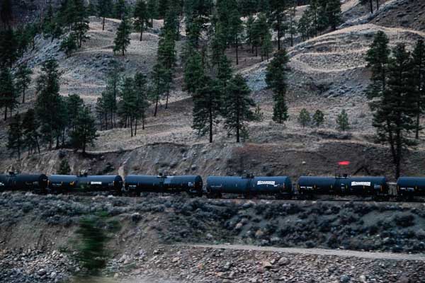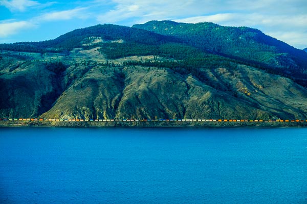 The Mondrian Railway works its way down the Fraser River.
