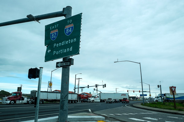 Hello Oregon. Hello big truck traffic! It appears one of the mega haulers likely bent the interstate directional sign.