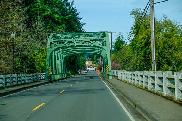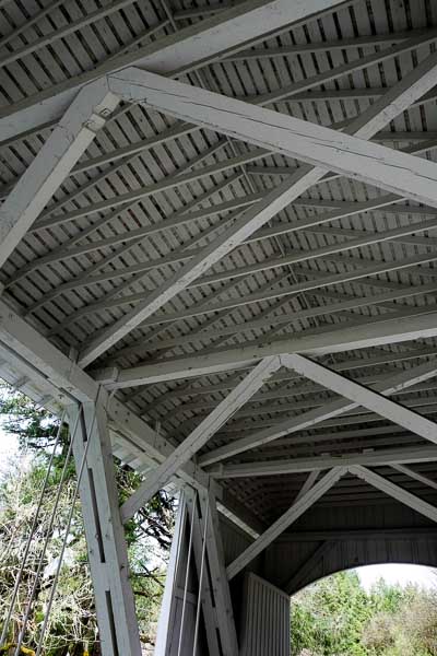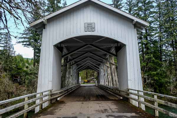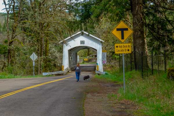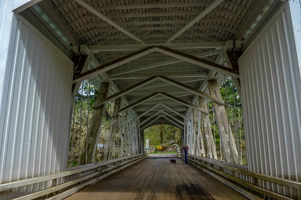 We cross a covered bridge.
