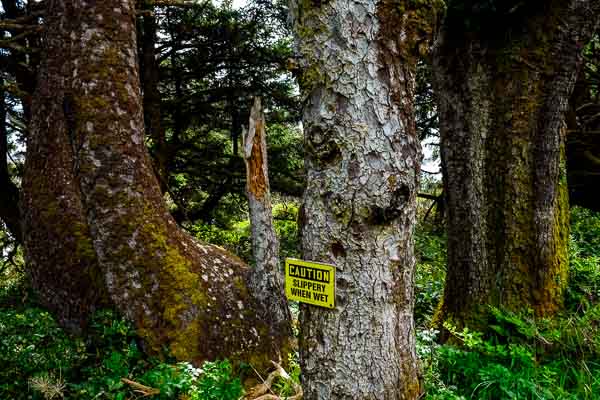 These trees are known to be unusually slippery when wet. So much so that the Park Service has installed warnings. Still, there is always a small heap of tourists lying in the stinging nettles below, after trying to disprove the fact.