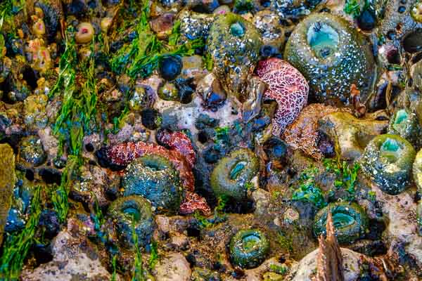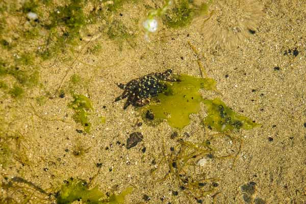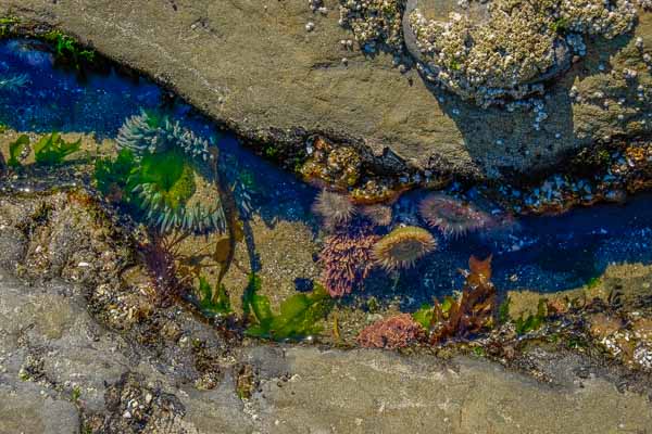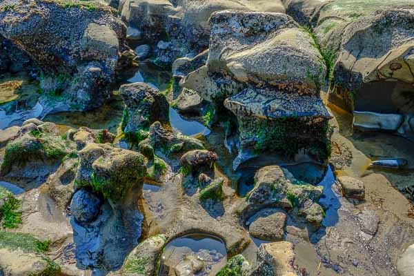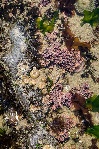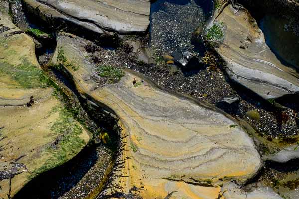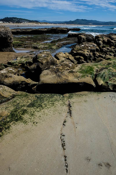 A line of small rocks and shells are wedged into this crack that points the way towards Bob Straub Park.